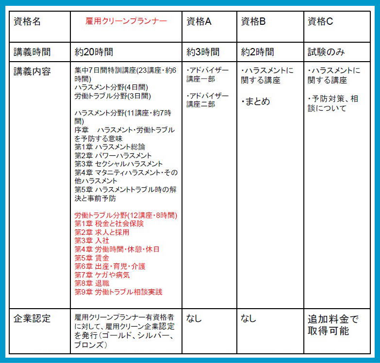 1)労働トラブル対策まで学べるハラスメント認定資格は雇用クリーンプラ ンナーだけ